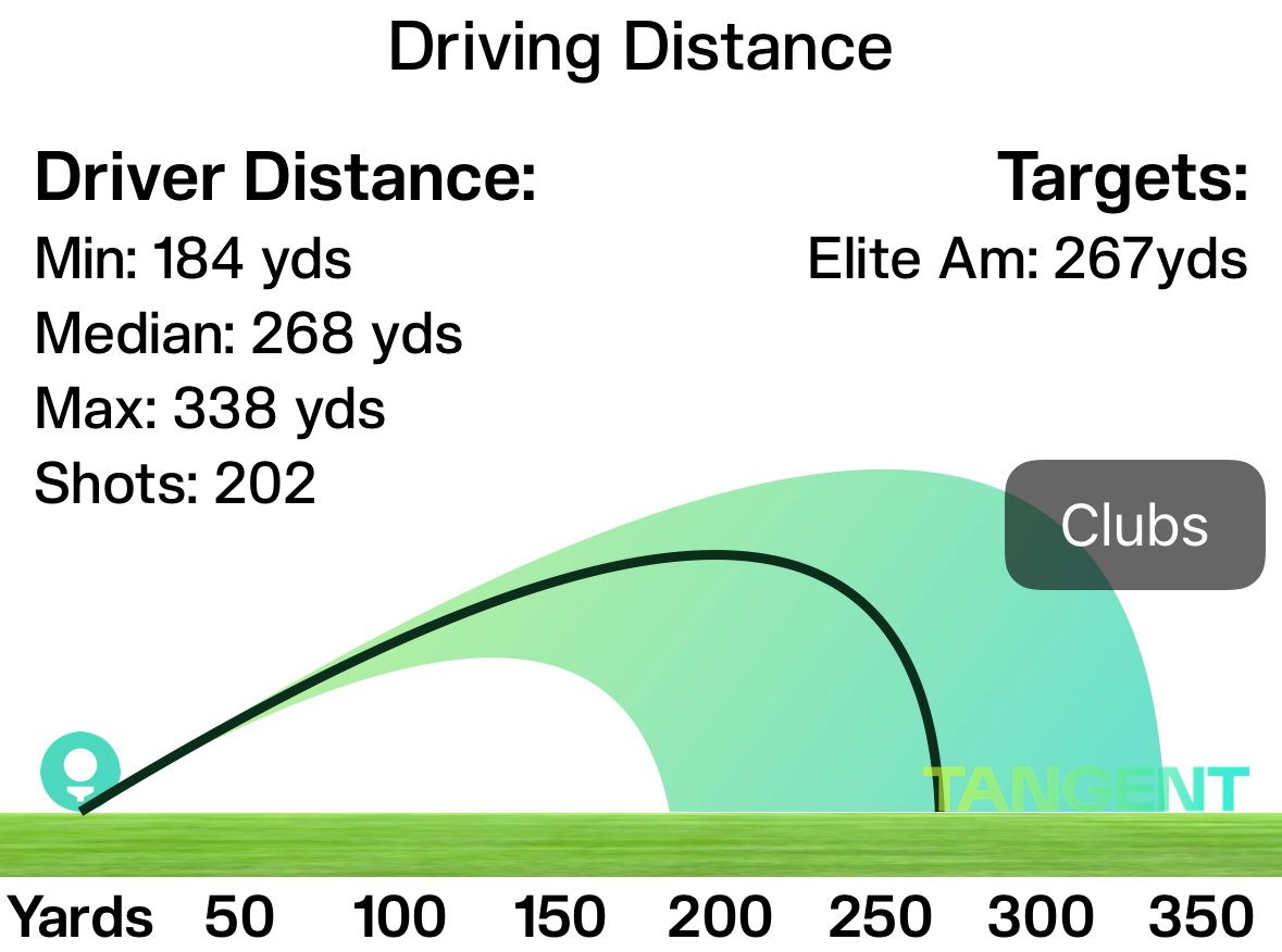 According the the USGA, golfers overestimate their driving distance capability by over 7%. For the average male, thats somewhere between 14-20 yards. But driving distance is easy to measure with tools like TANGENT Golf that will do it in the background. Simply start a round and let the automatic shot tracking do the heavy lifting to unlock a nice driving distance report at the end of the round.