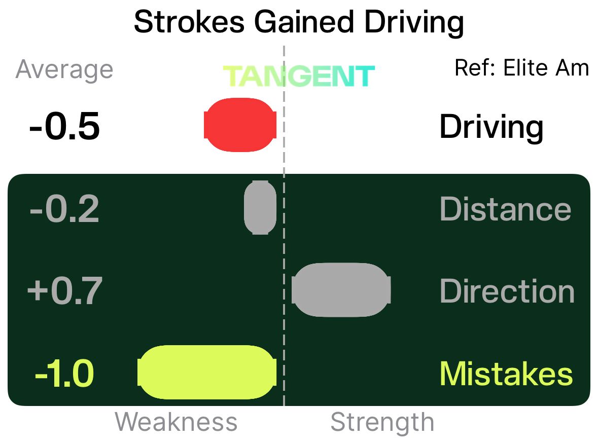 This means driving distance is not really an advantage for me, it’s simply not holding me back from my goals. It’s an area I’m looking to improve in 2025, but more on that later in this newsletter. Diving deeper in to the Driving section of the Player Report in TANGENT Golf, I can tell driving distance is not an advantage for me. For the last 20 rounds, I’ve lost 0.5 strokes on average to my target of an Elite Amateur and 0.2 of that was due to distance. As I chase my goal to win the US Mid Am, I need to turn this into more of a strength.