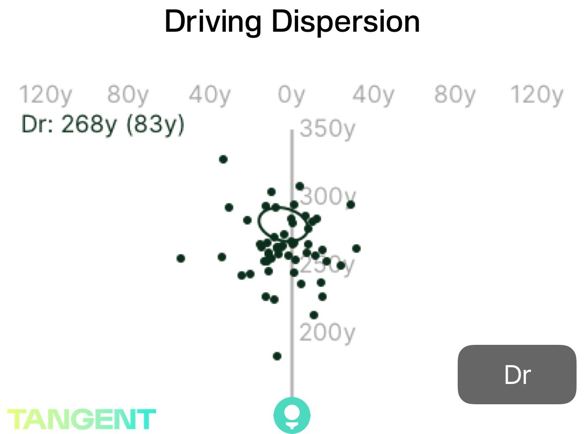 Driving dispersion chart in TANGENT. The dispersion charts use the Median distance after throwing out outliers focusing on what good drives do. Here my median drive is 268 yards and slightly biased to the left.