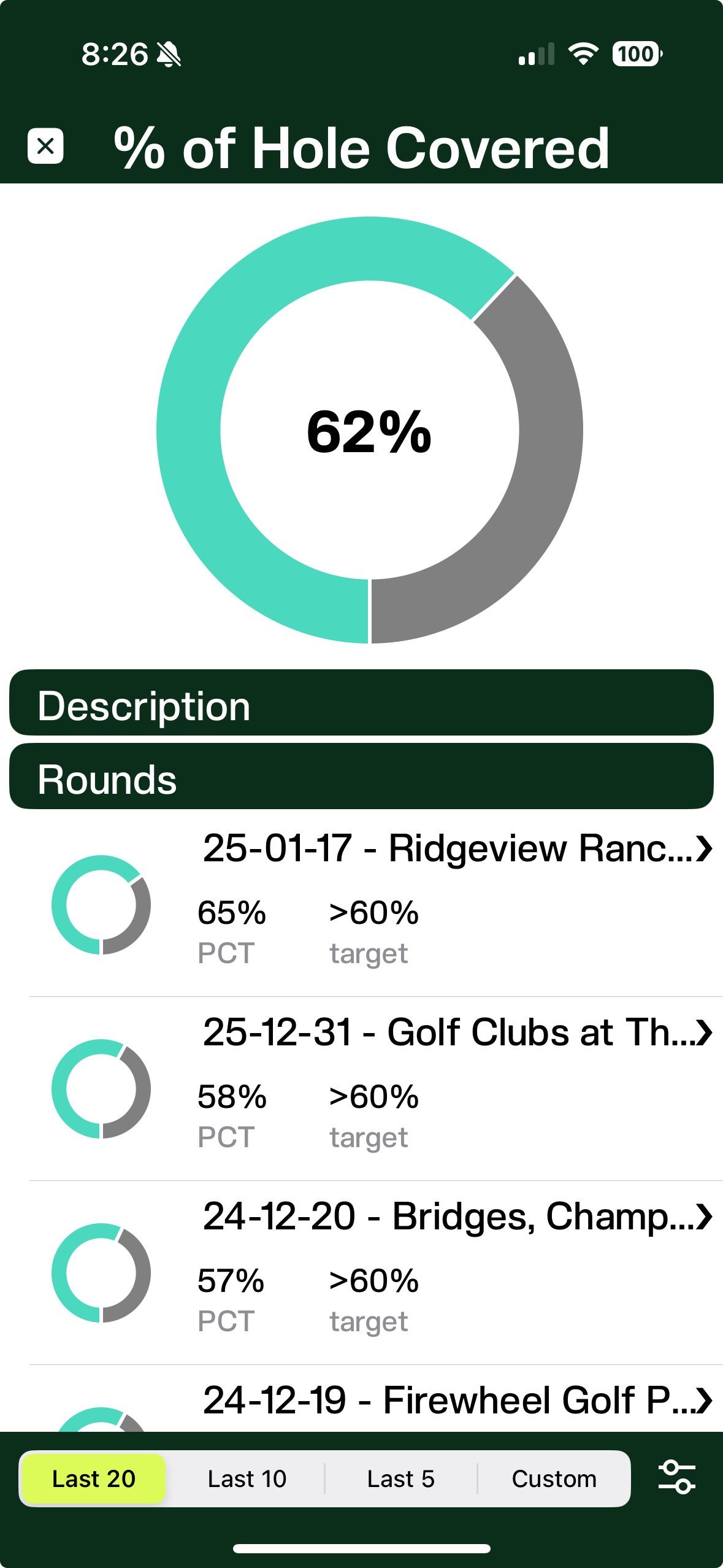 Clicking that allows you to dive into how much of the holes is covered by your tee shots, including a round by round break down. Overall, I cover 62% of the hole with my drives in my last 20 rounds, but at the bottom of the below graphic you’ll see several rounds in the 50s.