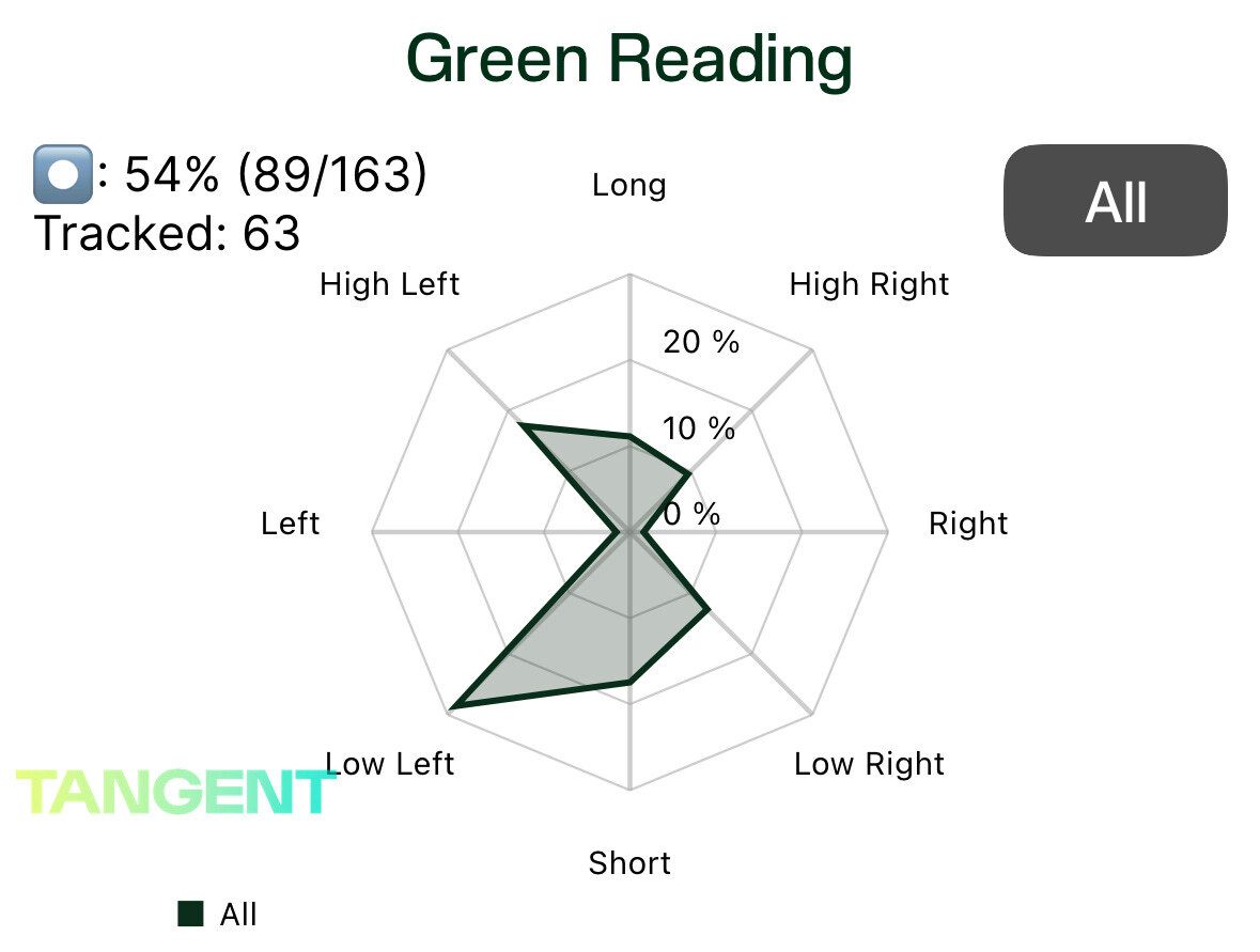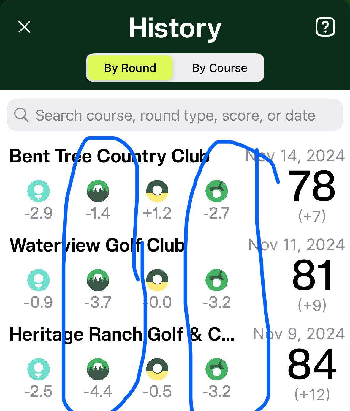 I found myself not having very much fun. My expectations and my play were not in sync. I was missing greens, missing putts, and falling into a poor pitiful me cycle of self-fulfilling bad golf. So how do we snap out of it? The first part is acceptance. Golf is hard. Really hard. Somedays we don't have it, even as our games improve. Grind one shot a time and let TANGENT track what's going on. With round review, you'll quickly see what parts of your game are struggling and be able to work on the right things to get back on track. For me... It's approach and putting. A quick glance at my round history shows those areas struggled.