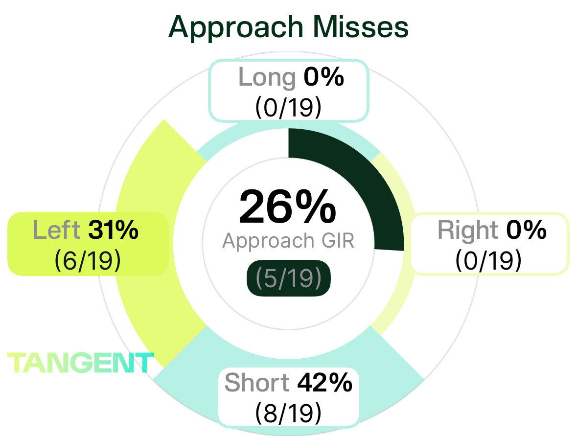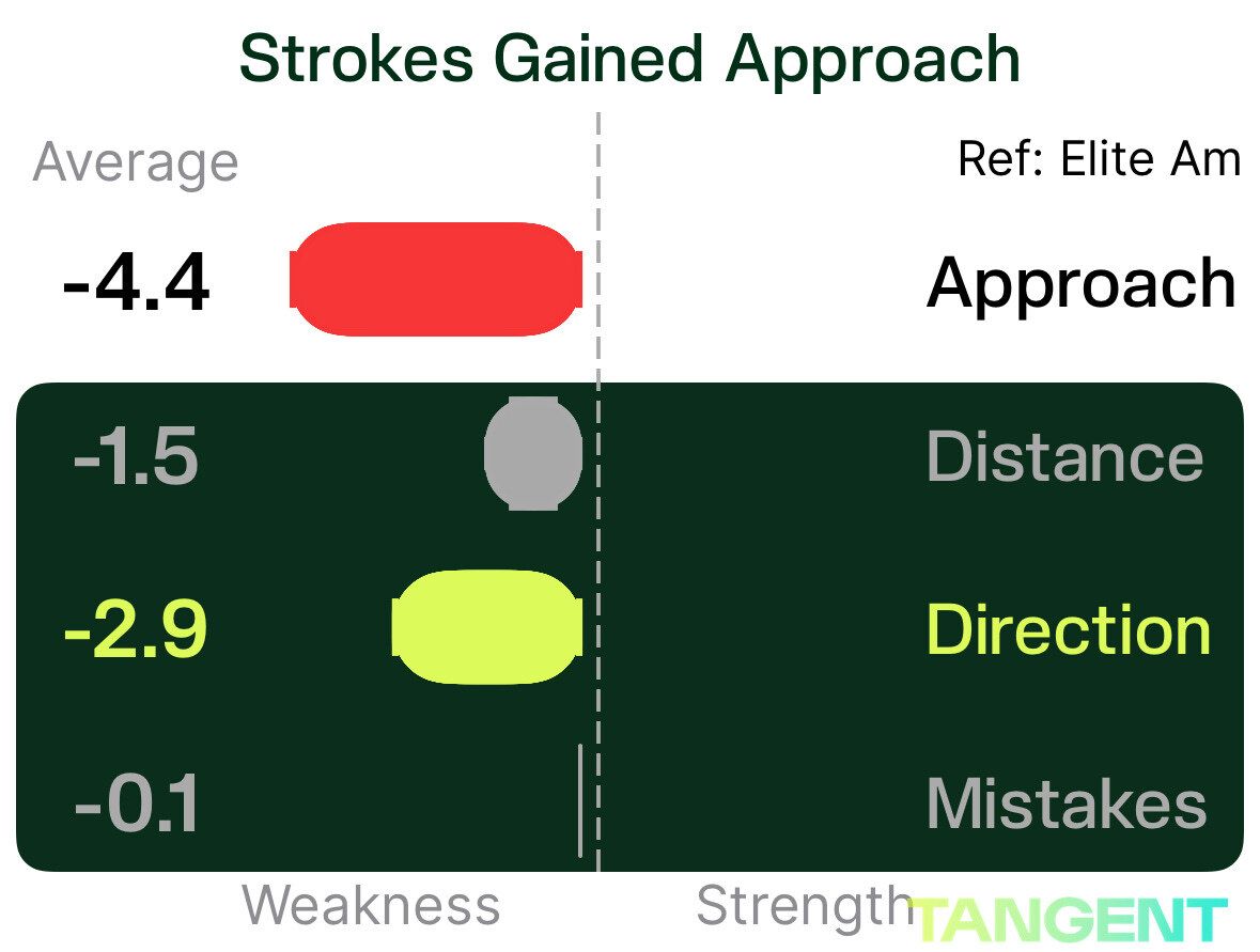 These are below my typical performance and I could tell something was off. More than just an aberration. A single round of dysfunction can be chalked up as an off day. I wouldn’t put too much stock in it… but 4 rounds in a row! I have been ready to pull my hair out. So let’s use TANGENT to dive in starting with approach where it is clear that I’ve been struggling with direction. This lines up. I’ve felt like I’ve been hitting the ball solid, but its not getting on line.